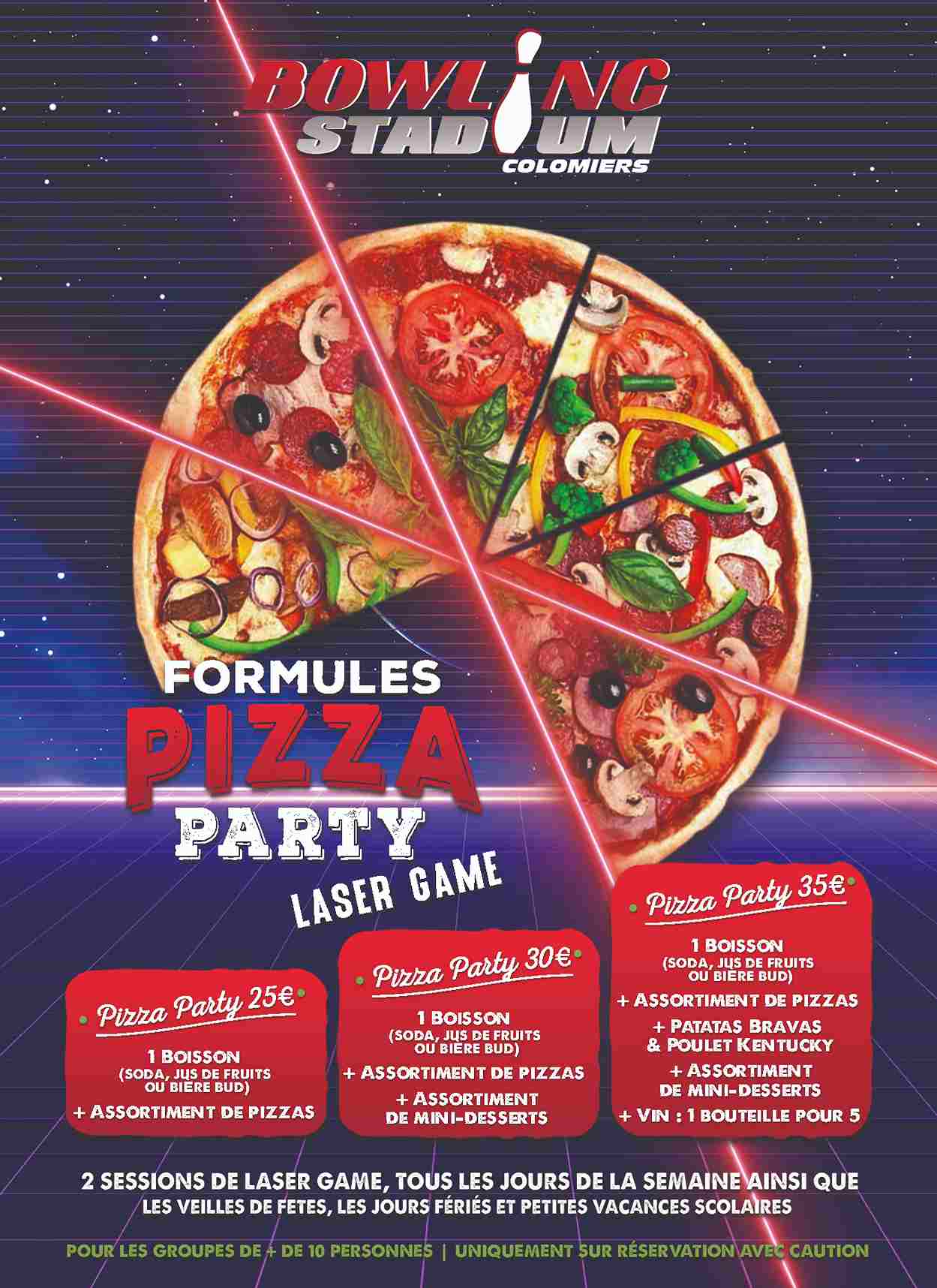 25€ : 1 pizza + 1 boisson + 2 parties de 20 minutes, valable tous les jours hors samedi soir (boisson soft ou bière BUD)