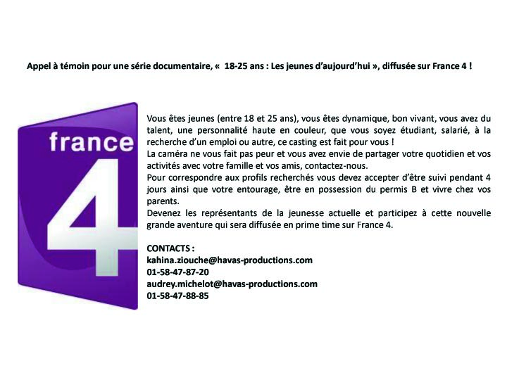 FRANCE 4 est à la recherche de 8 profils représentatifs de la France et de la jeunesse actuelle pour une émission qui s’appellera « 18/25 ans : la jeunesse d’aujourd’hui« .